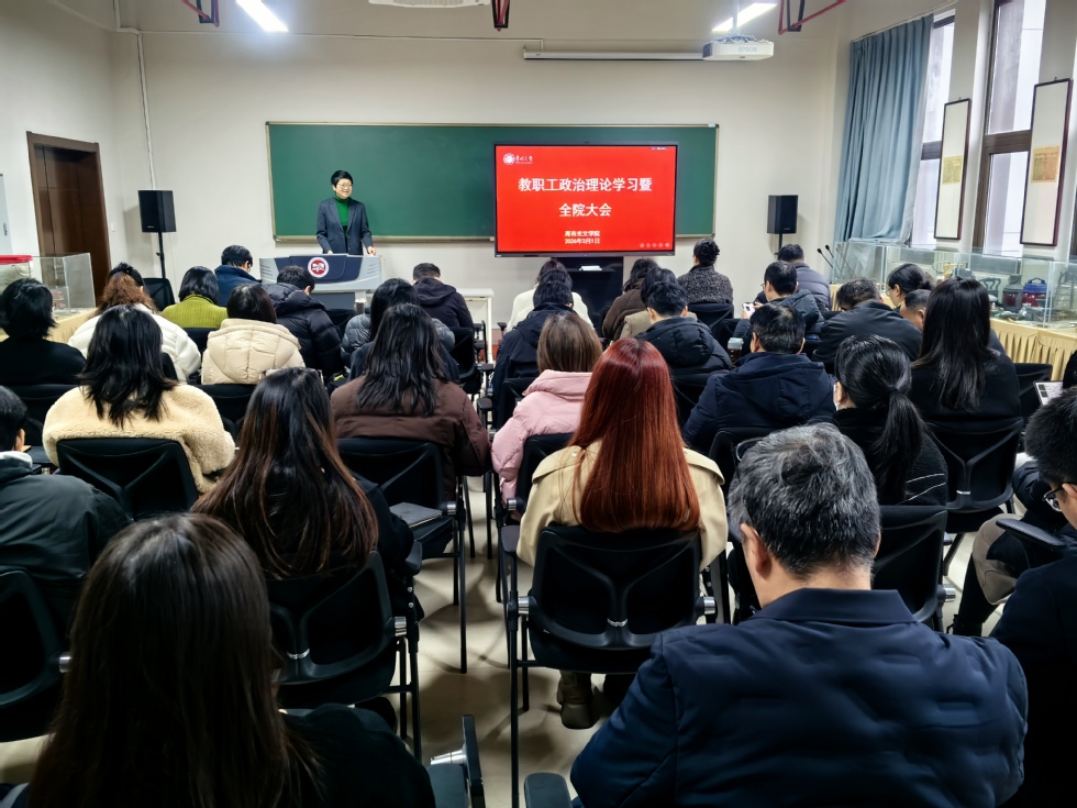 3月1日上午,人前露出 在立言楼342室召开教职工政治理论学习暨全院教职工大会,全体领导班子出席会议,全体教师参加会议,会议由院党委书记焦洁庆主持。